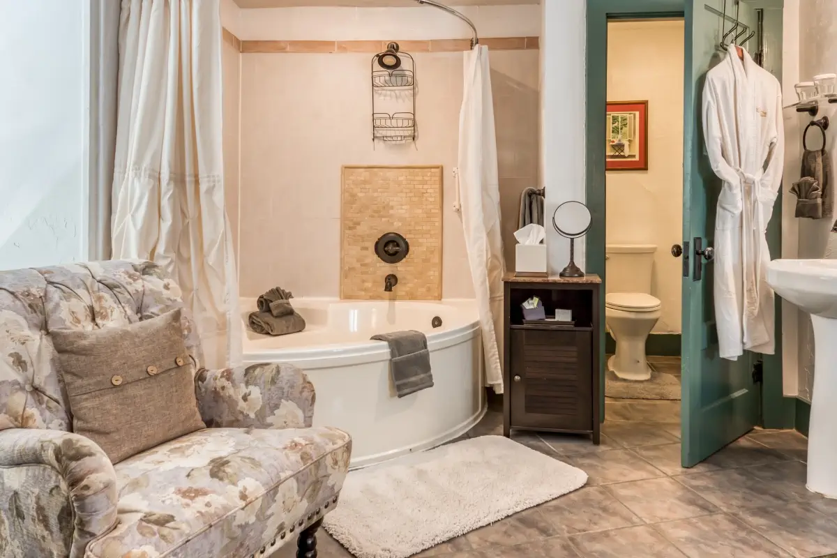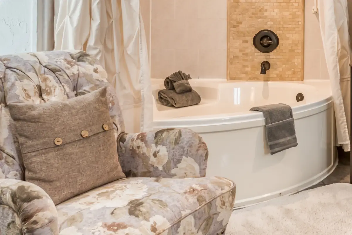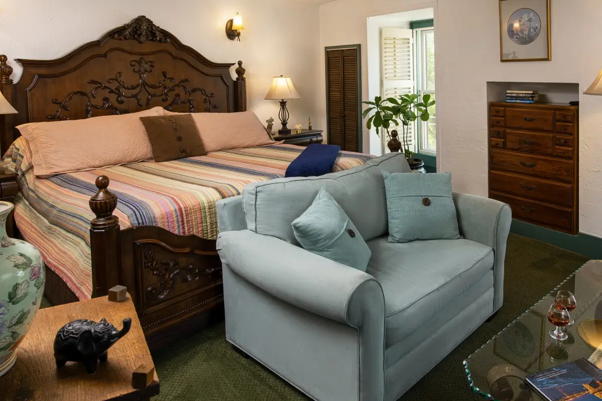 The Overlook Room welcomes you to a private third-floor sanctuary with sweeping views above the parks and rooftops of historic St. Augustine. Stretch out on a plush king-sized bed, unwind in your in-room oversized jacuzzi tub and shower, and enjoy the convenience of a refrigerator and microwave for light snacks or late-night treats. A cozy loveseat easily unfolds into a twin bed, making this room perfect for small groups or couples seeking a romantic getaway or a relaxing escape.
