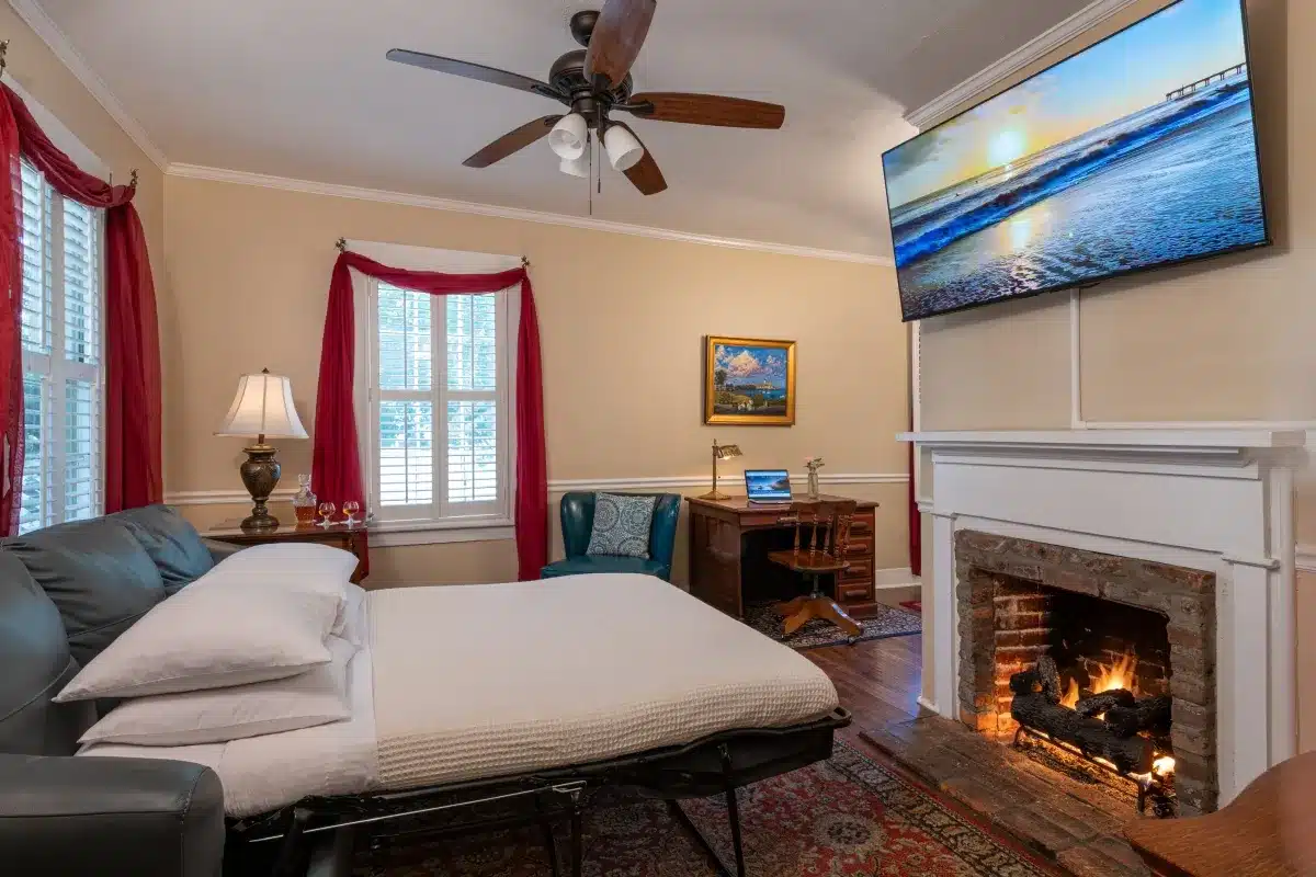 Saffron’s Suite invites you to stretch out and relax in the Wilson House, a historic gem just steps from the Main Inn at St. Francis Inn. Perfect for couples or families, this spacious first-floor suite features a queen bed, a front sitting room with a queen sleeper sofa, and a warm gas fireplace for cozy nights in. The private bath with a whirlpool tub is made for unwinding after exploring all the things to do in St. Augustine.