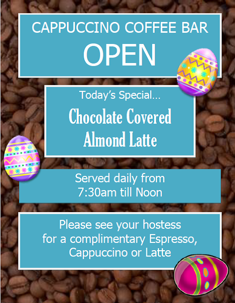 Janice delayed announcing April’s Specialty Coffee so no one would think it was an April Fool’s Joke.  And here it is:  Chocolate Covered Almond Latte!  Perfect for thoughts of spring and Easter.