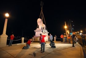 The lions made a grand entrance down King Street on the back of a large truck while being escorted by police patrol cars. Their sirens could be heard across town as they made their way to the bridge on an otherwise quiet and deserted night.